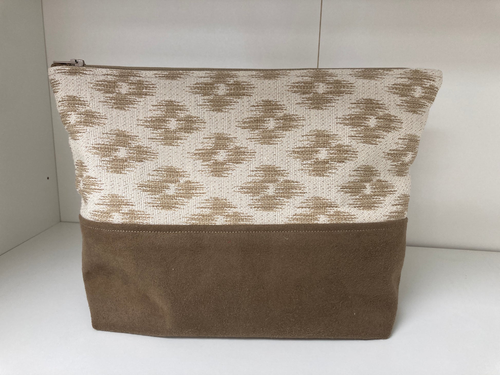 This pouch is handmade by me. The outside fabric is repurposed upholstery fabric rescued from fabric sample books. The bag has been interfaced to give the bag the ability to stand up. The interior is lightweight cotton fabric. Super useful for traveling and crafting to keep toiletries or projects organized.