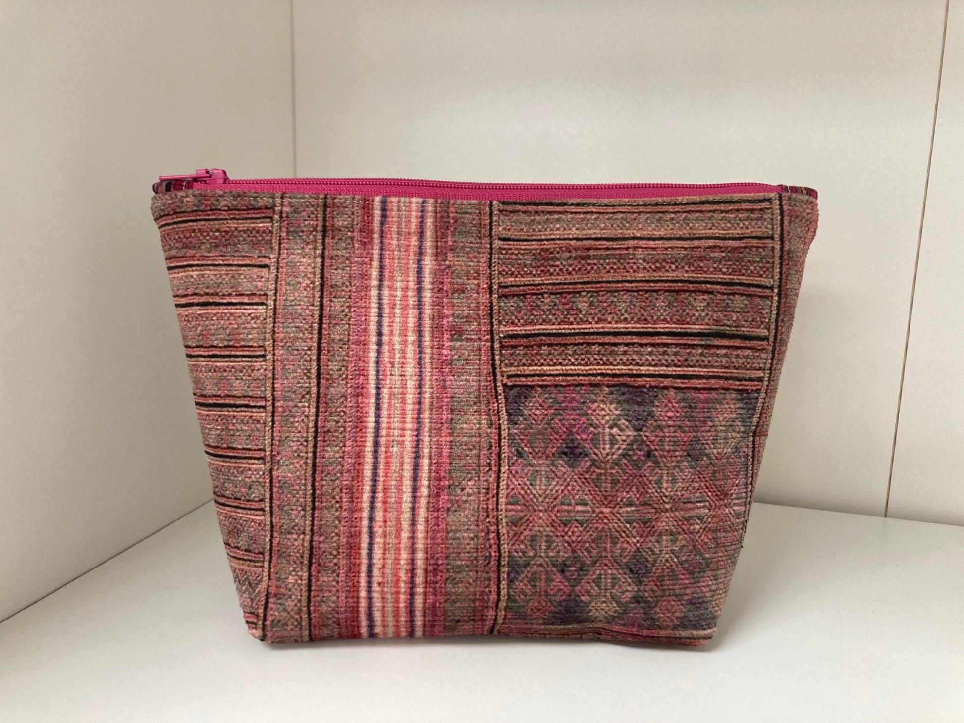 This pouch is handmade by me. The outside fabric is repurposed upholstery fabric rescued from fabric sample books. The bag has been interfaced to give the bag the ability to stand up. The interior is lightweight cotton fabric. Super useful for traveling and crafting to keep toiletries or projects organized.