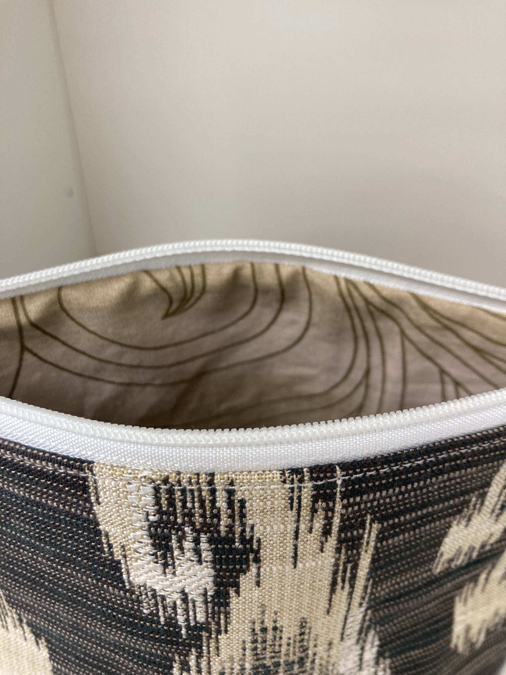 This pouch is handmade by me. The outside fabric is repurposed upholstery fabric rescued from fabric sample books. The bag has been interfaced to give the bag the ability to stand up. The interior is lightweight cotton fabric. Super useful for traveling and crafting to keep toiletries or projects organized.